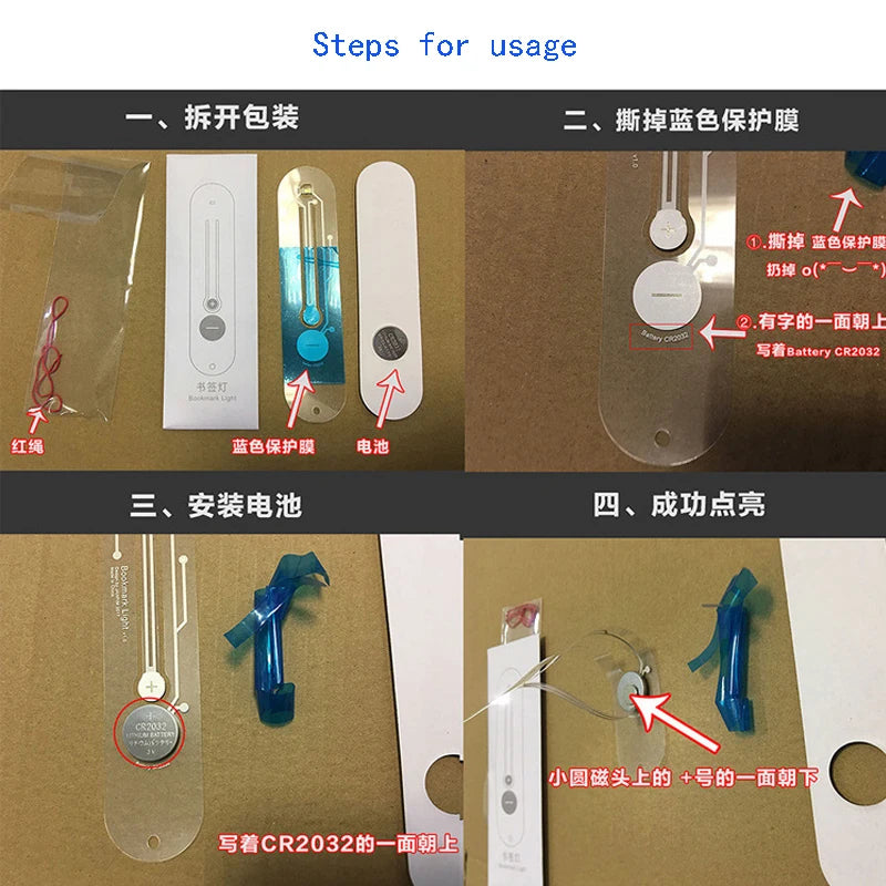 Easy to use. just attach the button battery to the "-" position in the bookmark, then press the "+" to the button battery, working.